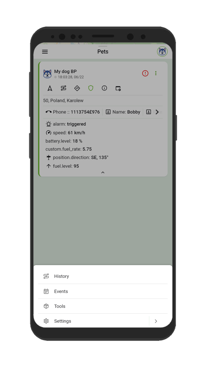 Also, the application collects data on the timeline (all information about the events of the unit: trips, parking, speeding, alarm messages, battery charge, towing, etc.) and on the history of trips (information about the track for a certain day or period of time).